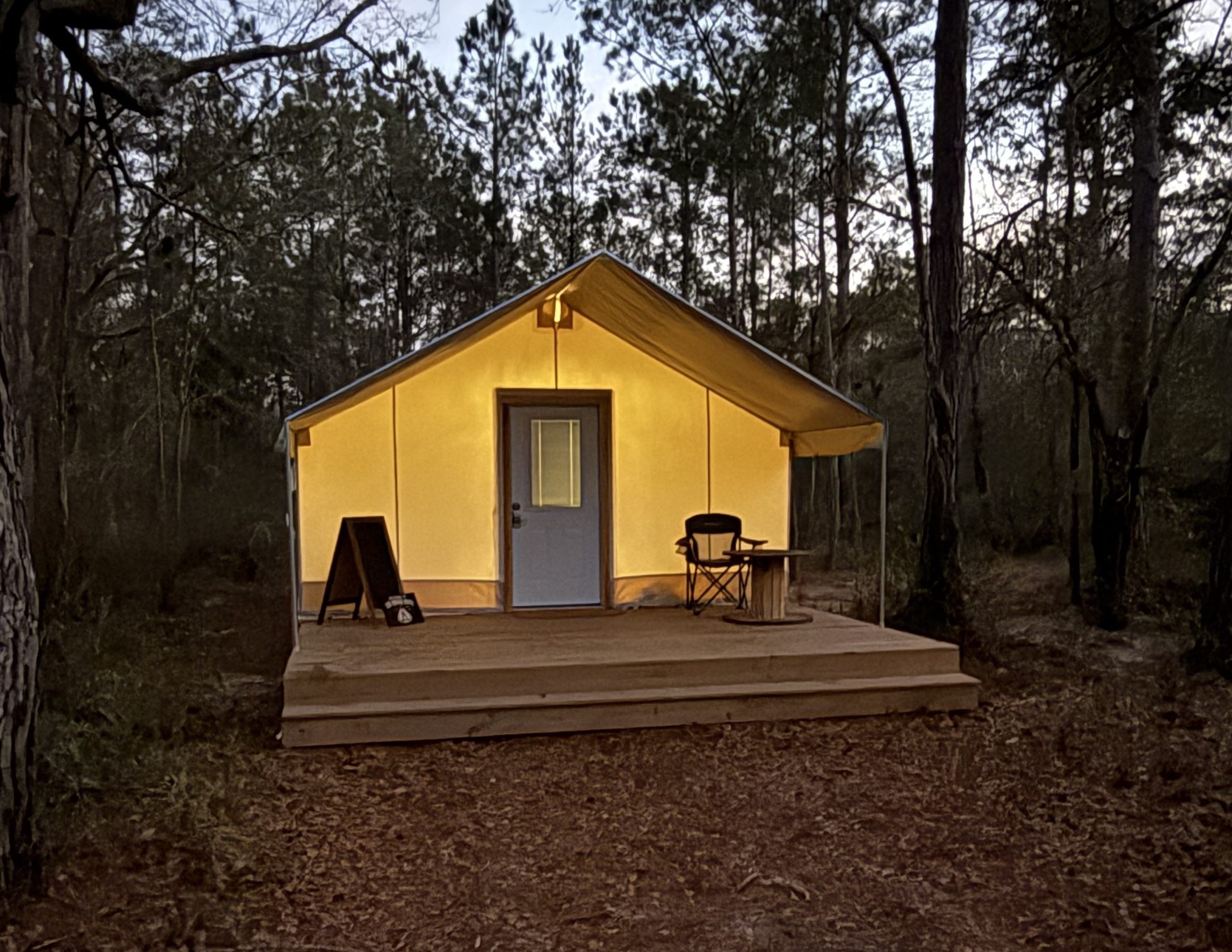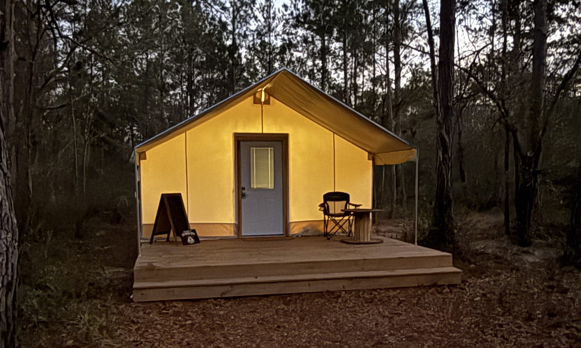 Arrive Friday to a quiet welcome and a fully prepared tent under the pines.